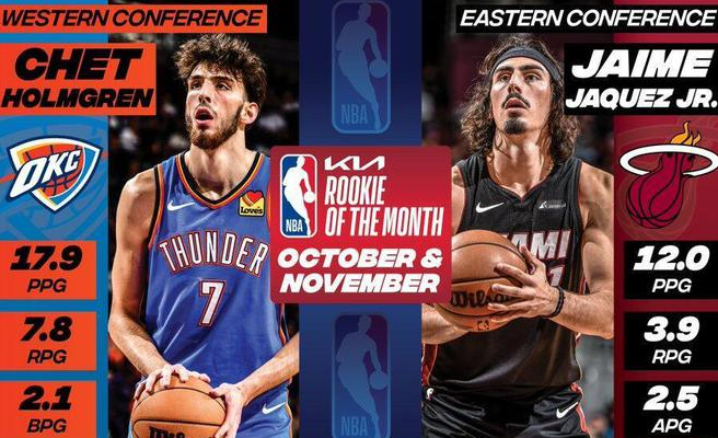 霍姆格伦力压文班亚马,当选了本赛季首次西部月最佳新秀。10-11月的比赛中,霍姆格伦场均贡献17.9分7.8篮板2.6助攻2.1盖帽,投篮命中率53.7%,三分命中率41%,罚球命中率87.1%。雷霆官方晒海报祝贺他获奖。